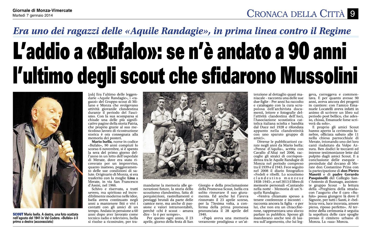 Mario Isella si è spento ieri sera, 1 gennaio 2014, nell'ospedale di Merate, all'età di 90 anni.